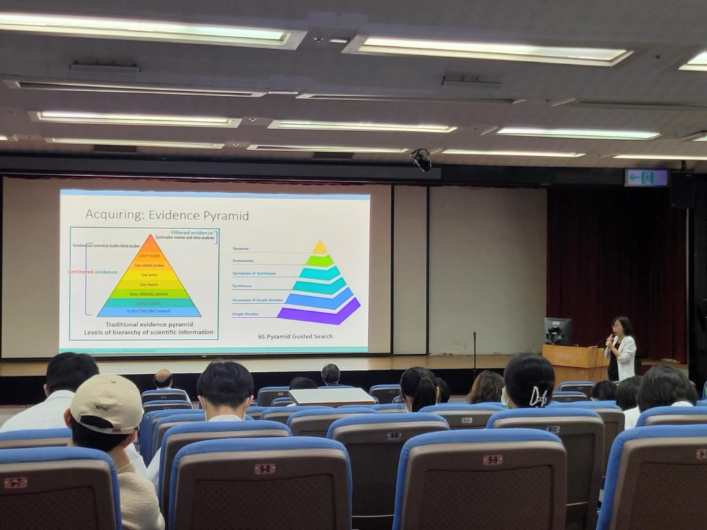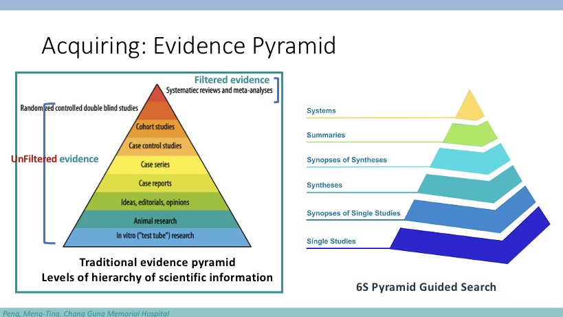 用實證醫學的5A步驟去看,再用證據金字塔6S評估可信度,找到最適合的治療,這應該就是這個晨會希望給住院醫師們帶來重點。這裡面最重要的是「新的證據金字塔」,跟我們住院醫師時代學的不太一樣:第一級的證據等級已由舊版的統合分析,改為資訊整合系統(幾年前的華生人工智慧?)接著就是具公信力的整合資料庫、再次是臨床指引,接著才是統合分析等等,我想這個跟一位專業醫師遇到問題的解決方法類似:與其一個一個資料評讀,煩惱哪個臨床實驗做得好還是不好,倒不如直接參考具公信力的資料,例如我一位癌症醫師,往往先找美國國家癌症研究院、歐洲癌症醫學會的治療指引。