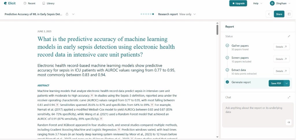 這種功能的價值在於它能夠自動完成文獻回顧的初步工作。傳統的文獻回顧需要研究者逐一閱讀相關論文,手動提取和比較不同研究的關鍵資訊,這個過程往往需要耗費大量時間。而Elicit將這個過程壓縮到幾分鐘內,它不僅能找到相關論文,還能自動分析和比較不同研究的發現,為研究者提供一個清晰的研究現況。