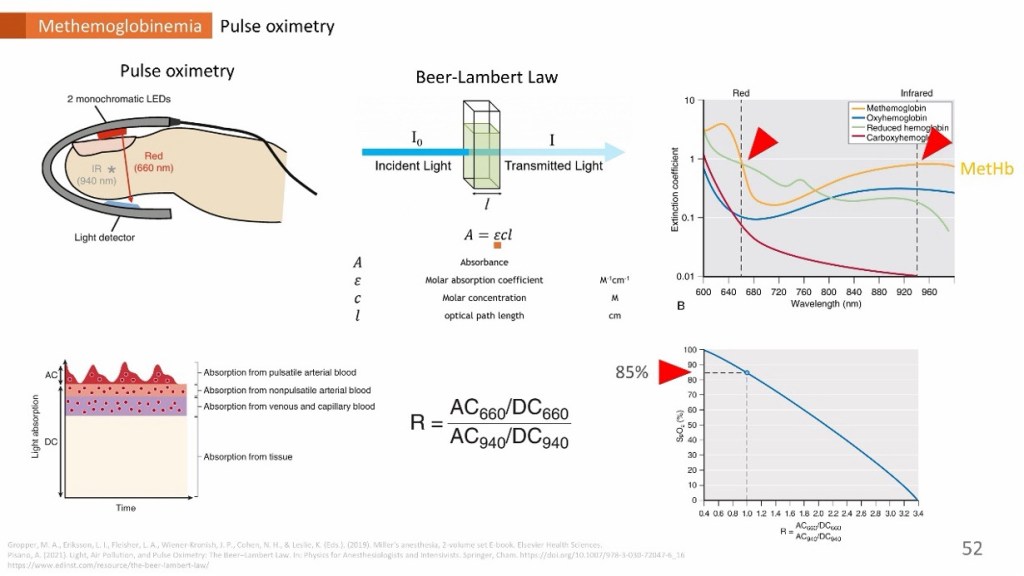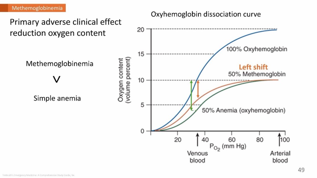 Methemoglobinemia最初常以 cyanosis表現,但PaO₂卻在正常範圍內,這成為診斷的關鍵。學長提到,這是因為血液中雖有充足氧氣,但血紅蛋白中的鐵由二價(Fe²⁺)氧化為三價(Fe³⁺),失去攜氧能力,使氧無法有效釋放至組織。此時 pulse oximetry 讀值常固定在約85%,與臨床狀況不符,因此需進一步進行 CO-oximetry panel 檢測,才能確定是否為methemoglobinemia。