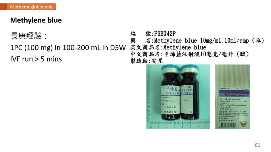 4. Methylene blue 的使用時機需更加謹慎。一般病人可使用,但在 G6PD deficiency的病人上可能造成反效果。如何在不延誤治療的前提下做出判斷,是值得建立的標準流程。