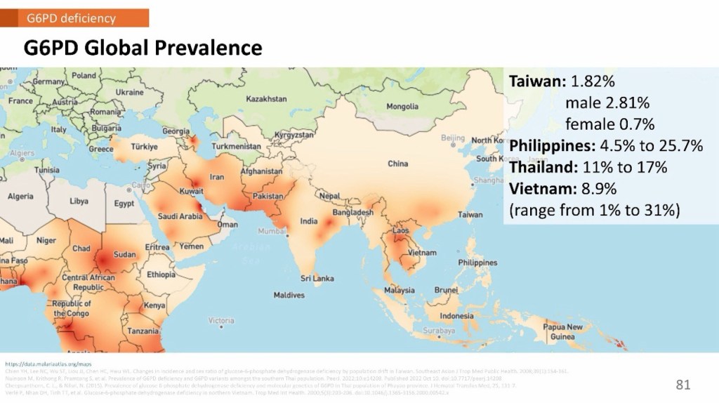 2. 族群風險不能忽略。菲律賓族群 G6PD deficiency 盛行率高達 25%。若病人出現黃疸、溶血或用藥後惡化,應及早納入鑑別診斷。可開立 blood smear 或 RBC morphology,如果需要快速確認G6PD deficiency,可以聯絡血液科與檢驗科討論。