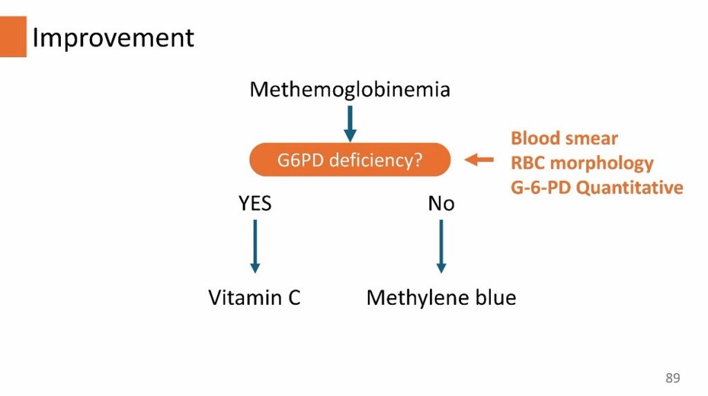 治療上,methylene blue 是主要解毒藥物,能透過NADPH將Fe³⁺還原回Fe²⁺,恢復血紅蛋白功能。然而在 G6PD患者中,由於無法產生足夠NADPH,反而可能誘發溶血,因此在治療前評估G6PD狀態是關鍵步驟。若無法立即使用methylene blue,可考慮輸血或維生素C輔助治療作為過渡措施。但困難的點在於,長庚的 G6PD 檢驗僅在週一、三、五執行,導致確認診斷需跨單位合作與等待檢驗結果,臨床與實驗室之間溝通協調更為重要。