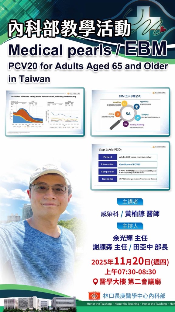 | 11/20 (四) 7:30-8:30 醫學大樓 第二會議廳 | Medical Pearls / EBM 黃柏諺醫師/ 余光輝主任 謝顯森主任 田亞中部長 | 實體無視訊 |