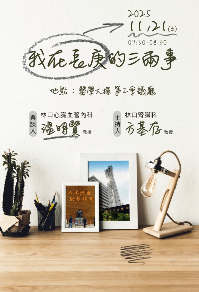 | 11/21 (五) 7:30-8:30 醫學大樓 第二會議廳 | 【全院】 我在長庚的三兩事 溫明賢教授 | 實體無視訊 |