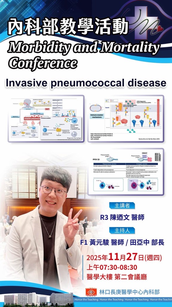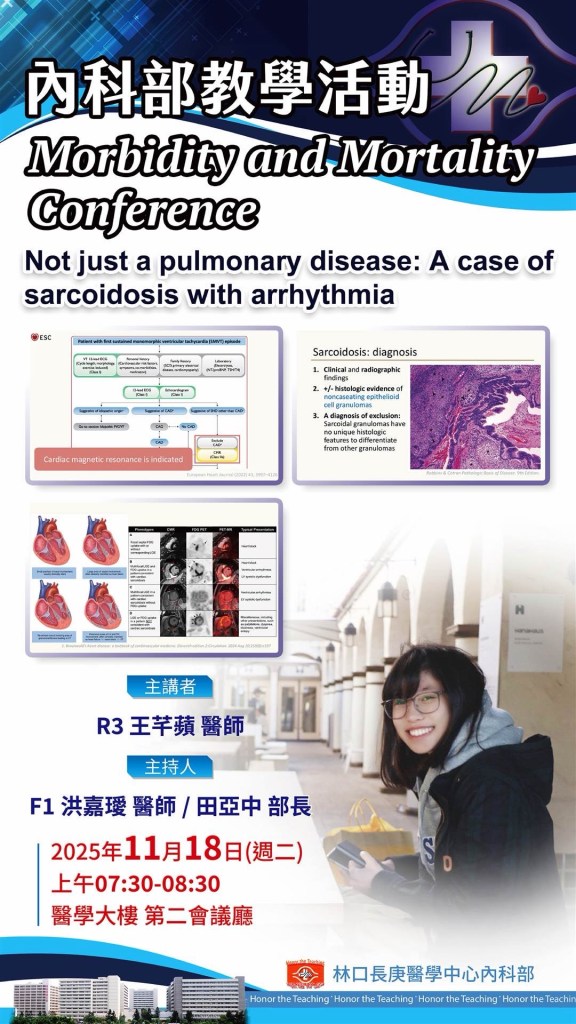 | 11/18 (二) 7:30-8:30 醫學大樓 第二會議廳 | Morbidity and Mortality Conference R3 王芊蘋 F1 洪嘉璦/ 田亞中部長 | https://cgmh.webex.com/cgmh/j.php?MTID=mde4fb7ef05115140cda612301f22700b |