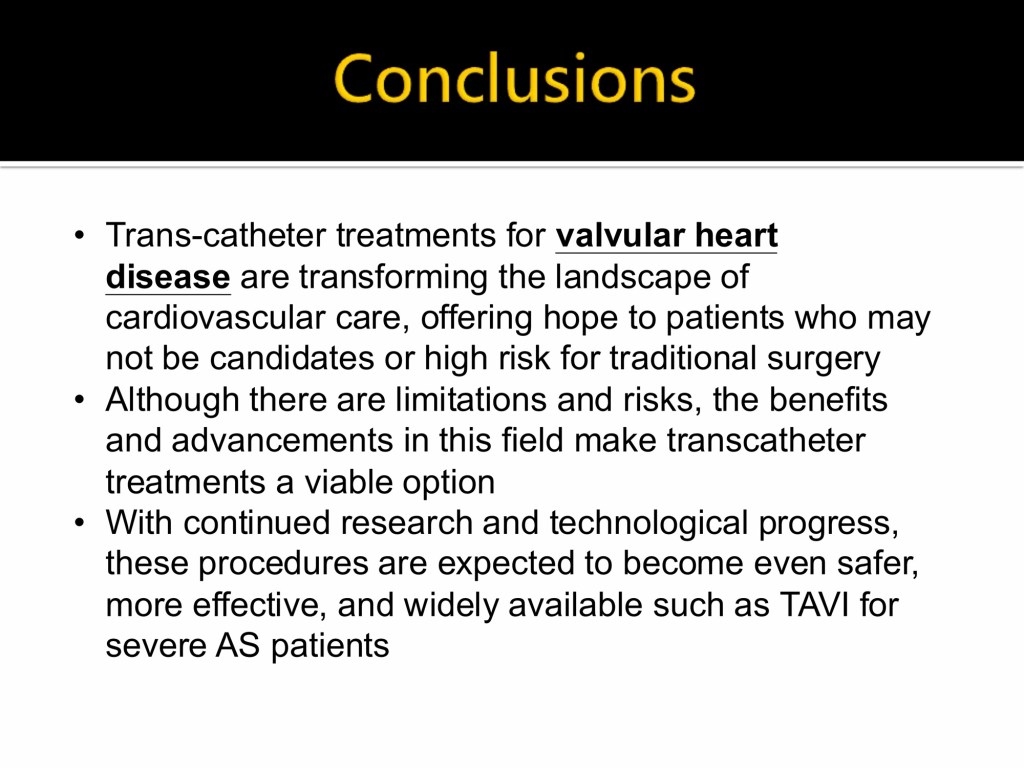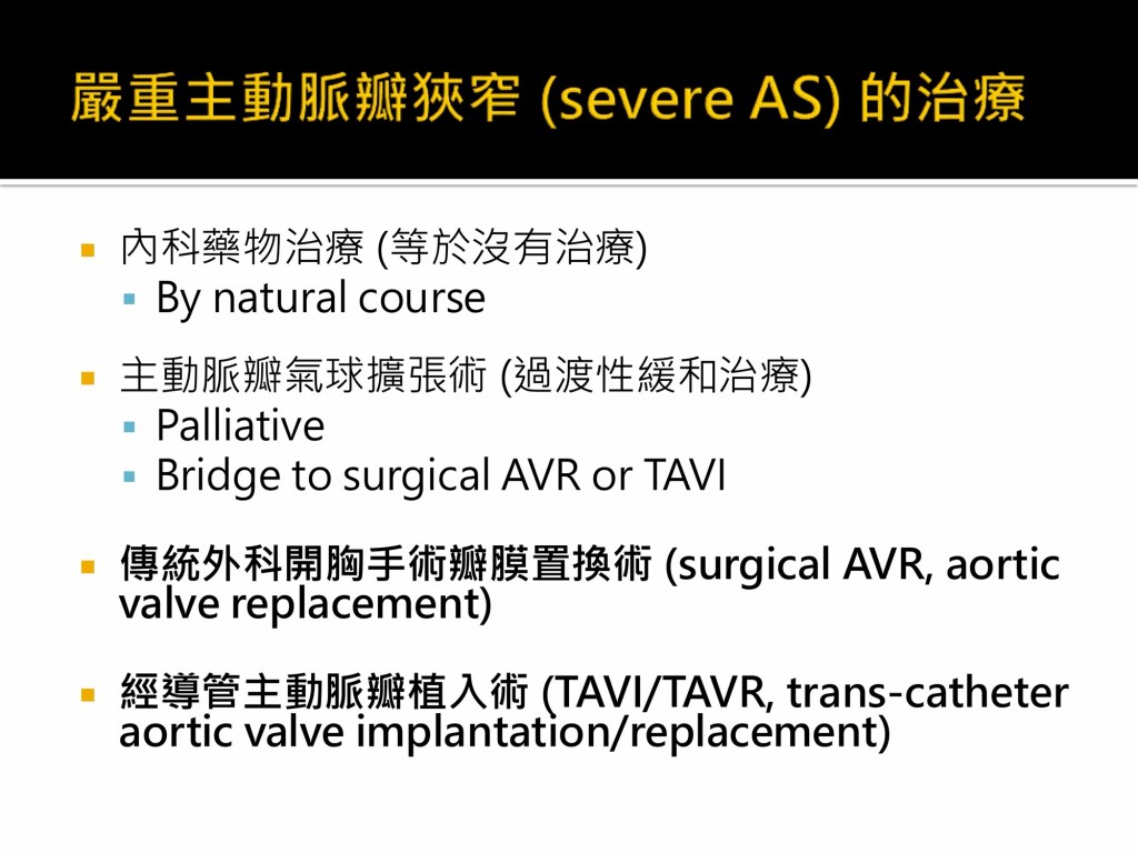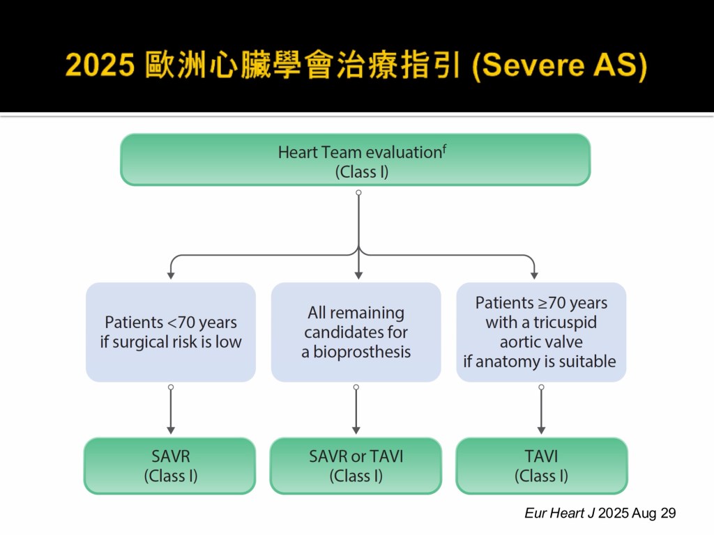演講的最後舉例,林醫師介紹了最著名的主動脈狹窄(aortic stenosis)之於導管治療的關係,最常拿來比較的即是傳統開胸手術瓣膜置換術(簡稱SAVR)以及經導管主動脈瓣膜植入術(簡稱TAVR),相較於SAVR,經導管的TAVR術後傷口小、手術時間短、住院天數短之外,在許多研究報告指出在某些條件下,術後成效與併發症皆不亞於SAVR,像是大於70歲的病人或是手術風險處於moderate情況下,TAVR反而會是優先考量,當然費用也是病人與醫師在做選擇時影響非常大的因素,不可否認經導管治療主動脈狹窄這類嚴重的疾病已是另一股強大上升的趨勢。