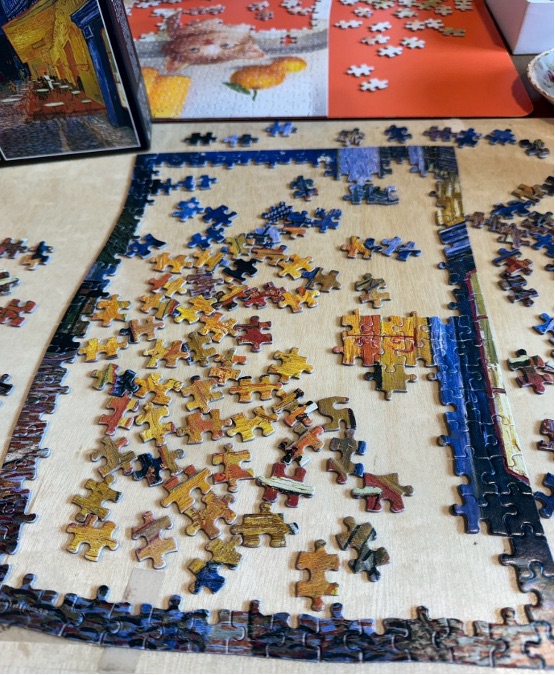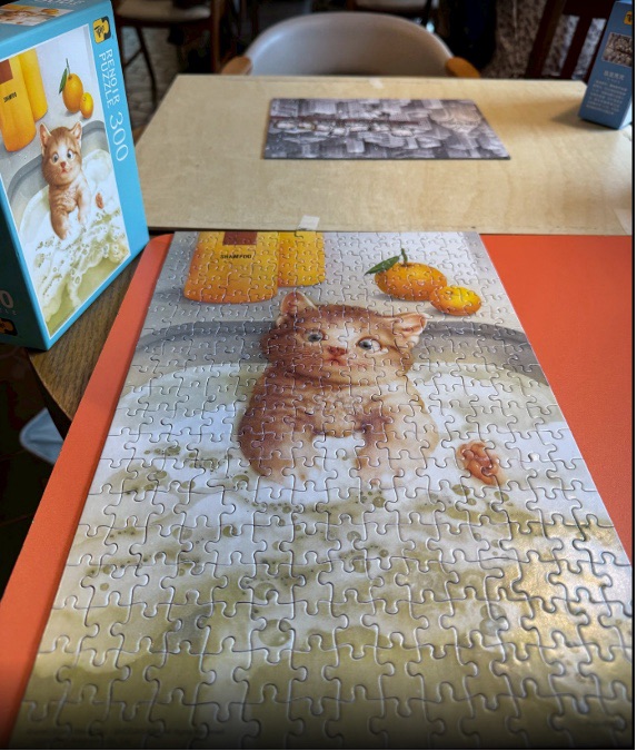除此之外,最近也迷上了益智類遊戲,從密室逃脫到大富翁,很喜歡解謎思考的感覺。喜歡和他人一同歡笑也偶爾喜歡一人慢慢思考,這時候拼圖咖啡廳就是讓人放鬆的好選擇。在一個安靜的午後一人躲進城市的一角,吃完點心後邊喝著下午茶,開始慢慢地拼起屬於自己拼圖,遠離一切紛擾。切記,我們是來讓自己放鬆的,所以不要選個太難的這樣不但沒放鬆到還會莫名的氣自己。個人經驗200-300片左右的拼圖就十分適合,拚完十分有成就感。