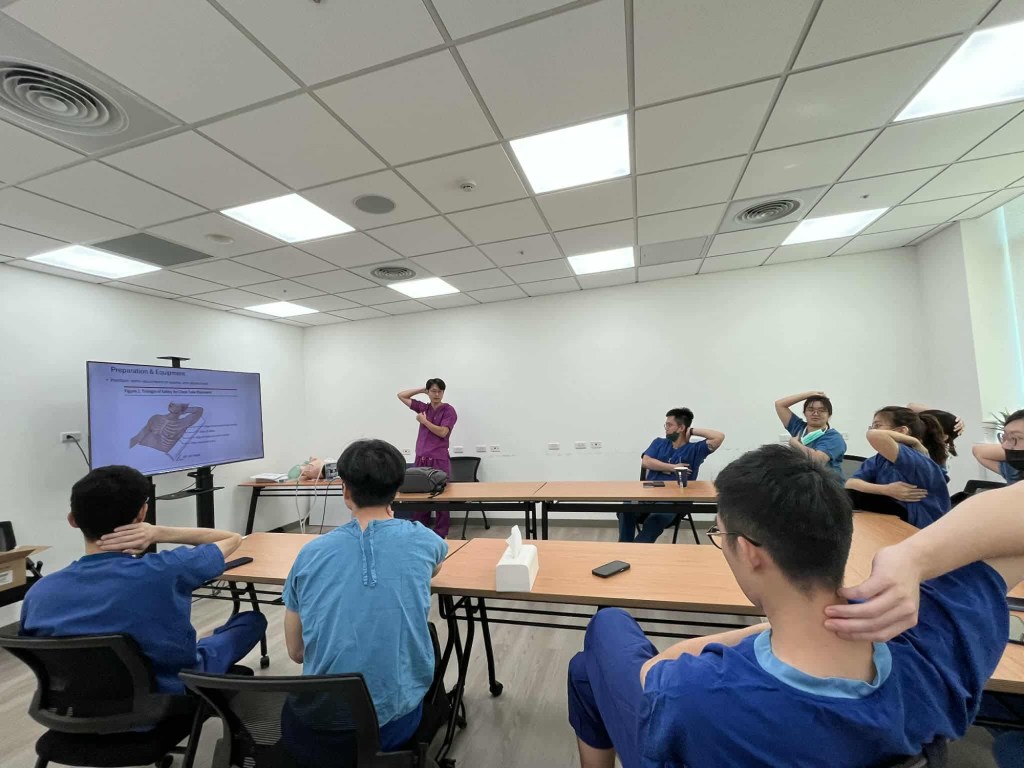 課程亦強調病人擺位的重要性,通常採躺平、施術側手枕在頭下。講師也示範如何以超音波在床邊判定最佳穿刺位置,強調「triangle of safety」的解剖標誌,並提醒腋中線仍有血管分布需避免誤傷。胸管放置後若功能不佳,學長姐也逐一示範 troubleshooting 的步驟,非常實用。