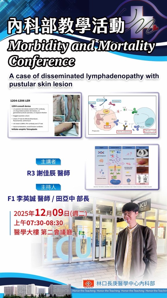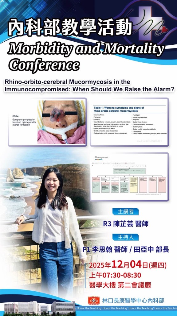| 12/4 (四) 7:30-8:30 醫學大樓 第二會議廳 | Morbidity and Mortality Conference R3 陳芷芸 F1 李思翰/ 田亞中部長 | https://cgmh.webex.com/cgmh/j.php?MTID=me62f7e0789f12198bc238c0903fa02bd |