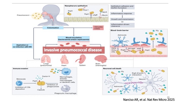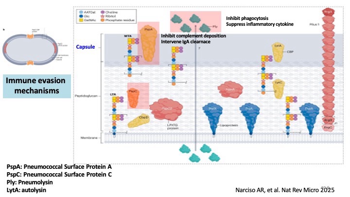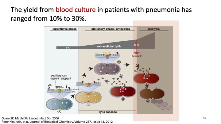 在鑑別診斷與治療的解析中,陳醫師針對侵襲性肺炎鏈球菌疾病(IPD)做了非常完整的講解,包括感染路徑、免疫逃脫機制、血流感染的臨床型態、尿抗原與血培養的敏感度與限制。讓我印象深刻的是醫師提到 IPD 在成人重症肺炎中還是佔有非常高的比例,而這位病人的三套blood culture都在早期就長出 S. pneumoniae,呼應了文獻中高度菌血症的特性,也強化了及早給予適當抗生素的重要性。