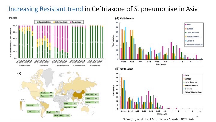 後續討論延伸至侵襲性肺炎鏈球菌疾病(IPD)的治療原則、抗生素抗藥性趨勢變化,以及新一代 PCV 疫苗的預防價值,提供從急性治療到公衛預防的完整視角。針對 CAP 第一線抗生素選擇,師長們意見不一:從長遠抗藥性控制角度,需審慎使用 carbapenem 類藥物;但在病人病況危急、資訊不完整的情境下,初期廣效抗生素仍具合理性。折衷策略則是:在病情穩定後儘早進行抗生素降階,降低後續 CR/MDR 菌株篩選的風險,但其時機仍高度仰賴臨床判斷,難以以單一指標量化決策。