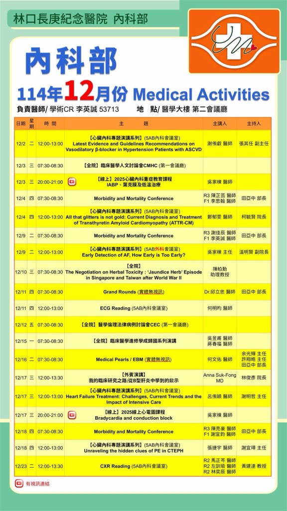 | 12/11 (四) 12:00-13:00 醫學大樓 5AB內科會議室 | ECG Reading 何明昀醫師 | https://cgmh.webex.com/cgmh/j.php?MTID=m597ba85145af4f21c23988a9cc139dd3 |
