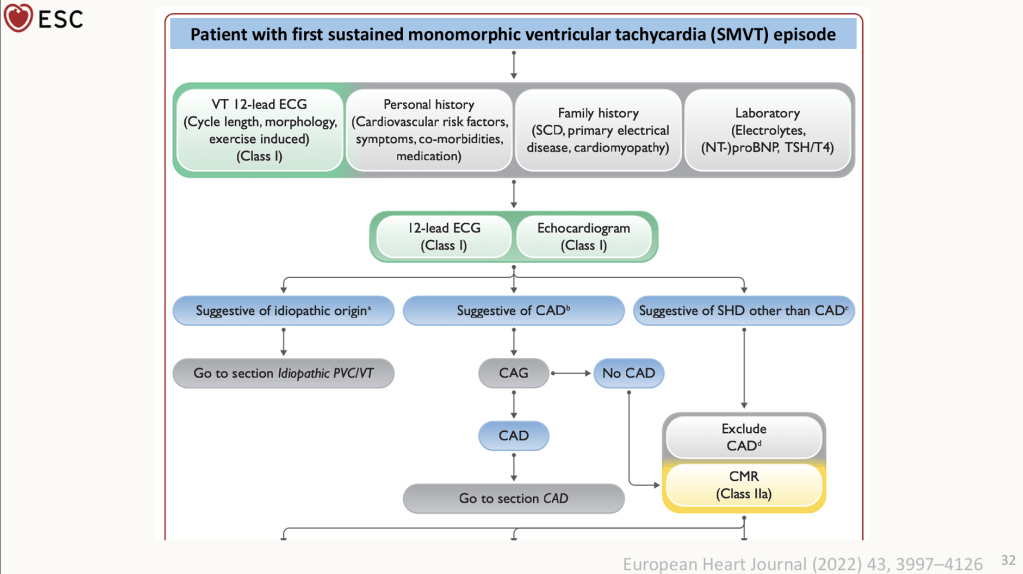 一位五十餘歲女性,既往病史僅有高血壓,無手術史,也無不良嗜好。職業為製造業,家族史方面,母親曾罹患乳癌,父親有高血壓,其餘親屬皆健康。她開始出現心悸、頭暈、胸悶、呼吸困難與冷汗等症狀,並於家中發生短暫昏厥,緊急送醫。抵達外院時,心跳高達194次/分鐘,收縮壓僅90/64 mmHg,初步懷疑為PSVT合併心因性休克,收治加護病房。心臟超音波顯示LVEF約21%,伴隨明顯的global hypokinesia及中重度二尖瓣逆流,但冠狀動脈攝影僅發現LCx輕微狹窄,無法解釋如此顯著的心臟衰竭。住院期間出現反覆的有脈性心室頻脈(VT),稍穩定後轉送林口長庚急診。抵達時生命徵象已相對穩定,NT-proBNP及高敏感度troponin I均有變化,白血球略升高,但腎功能、電解質及肝功能均正常。動脈血氣呈現輕度呼吸性鹼中毒。回溯病程,她早於心臟事件前便有臉神經麻痺、嗅覺下降與視力模糊等症狀,之後出現咳嗽、胸悶、呼吸急促,並被懷疑為肉芽腫性疾病。胸部CT過度顯影住院,影像顯示需鑑別淋巴瘤與肉芽腫疾病,後續淋巴結切片證實為granulomatous inflammation,胸腔門診傾向診斷為肺部肉芽腫疾病,開始類固醇治療。然而,她再次因sustained VT引發syncope而急診就醫。住院中安排心肌切片,但意外併發心包膜填塞,需要緊急心包穿刺與引流,甚至短暫出現PEA型態的院內心跳停止,好在經CPR恢復。後續心臟MRI高度支持心臟肉芽腫性疾病,因此在類固醇治療之外加上第二線免疫抑制劑。考量病患曾反覆VT,接受ICD植入。之後病況逐漸穩定,順利出院。最終診斷包括:sarcoidosis侵犯肺臟、心臟與眼部、Ventricular tachycardia secondary to cardiac sarcoidosis、院內心跳停止(IHCA)及心臟衰竭。