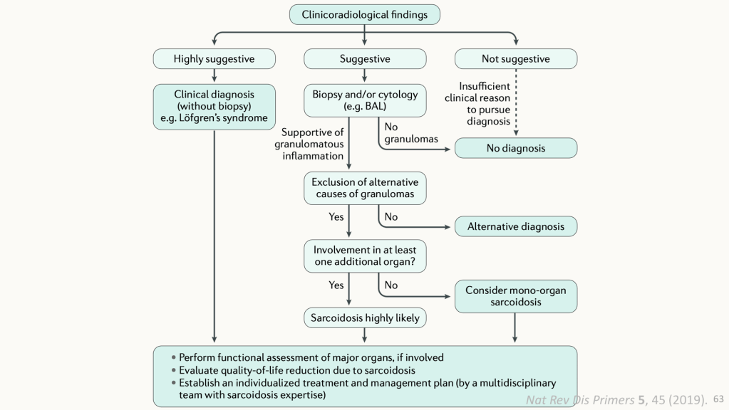 不論是在CCU的當下,或是後續準備報告的過程中,我都一而再地感受到Sarcoidosis/Cardiac sarcoidosis診斷上的困難。而閱讀文獻以及治療指引時,我不斷地因現實中所碰到的臨床情境無法和教科書、文獻完美相合而感到衝擊。主治醫師整合病人的病程以及臨床表現,進行每一步的醫療決策,讓我體認到一位醫師累積的臨床經驗有多麽重要:在CCU的我只是小小的住院醫師躲在主治醫師們所撐起的傘底下,而現在我只能先從診斷治療指引著手,並且期許自己能藉實戰的累積在未來不被指引框架住。