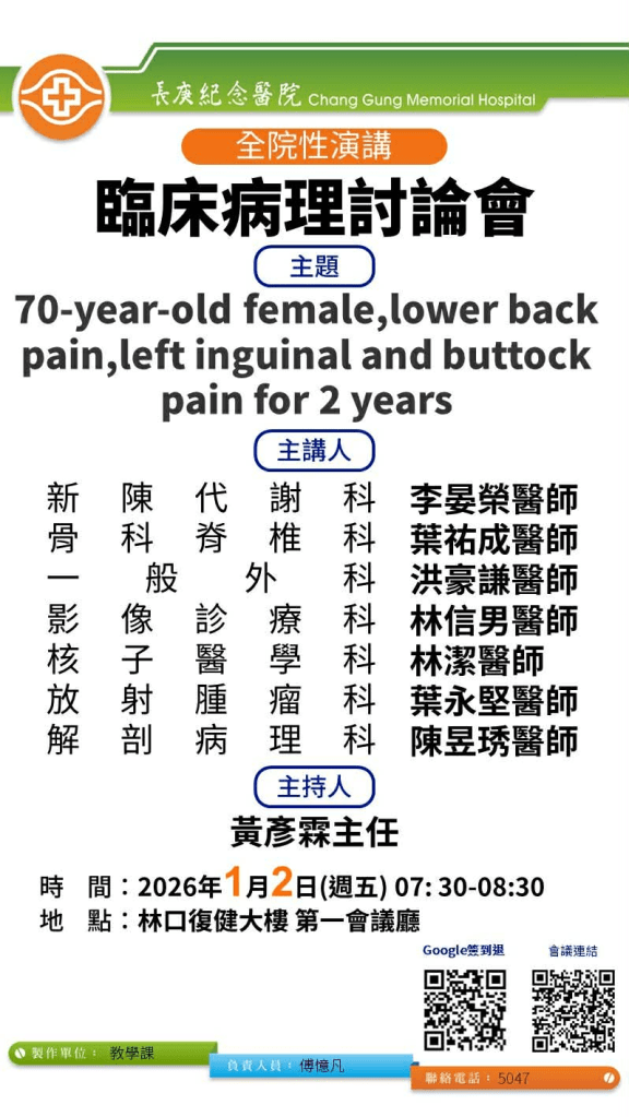 | 1/2 (五) 7:30-8:30 復健大樓 第一會議廳 | 【全院】 臨床病理討論會CPC | 實體無視訊 |