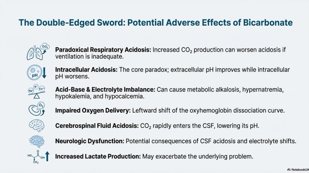 在治療策略的討論中,對 sodium bicarbonate 的使用上要考慮可能的危害,酸中毒狀態下氫離子本身無法通過 BBB,但若是補充 bicarbonate 會產生過多 CO₂,而 CO₂ 可自由通過 BBB,反而可能導致 paradoxical CNS acidosis 與神經功能損傷。這一點顛覆了我過去直覺認為「酸中毒補鹼應該能改善狀況」的想法,也讓我在未來面對重度酸中毒時,會更謹慎評估給藥時機與劑量。