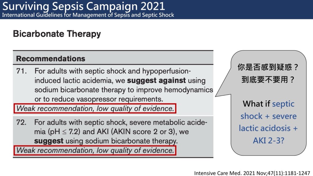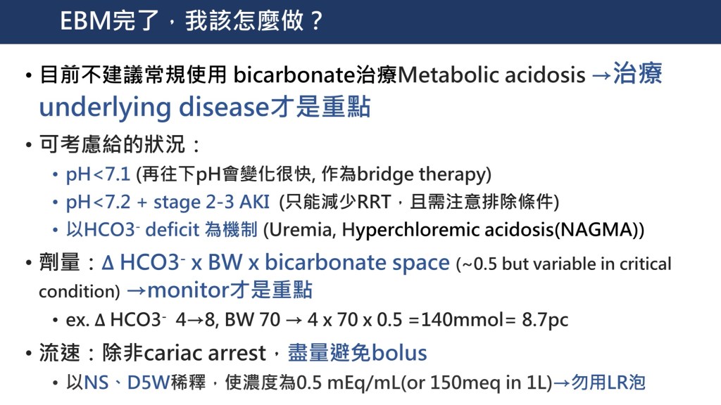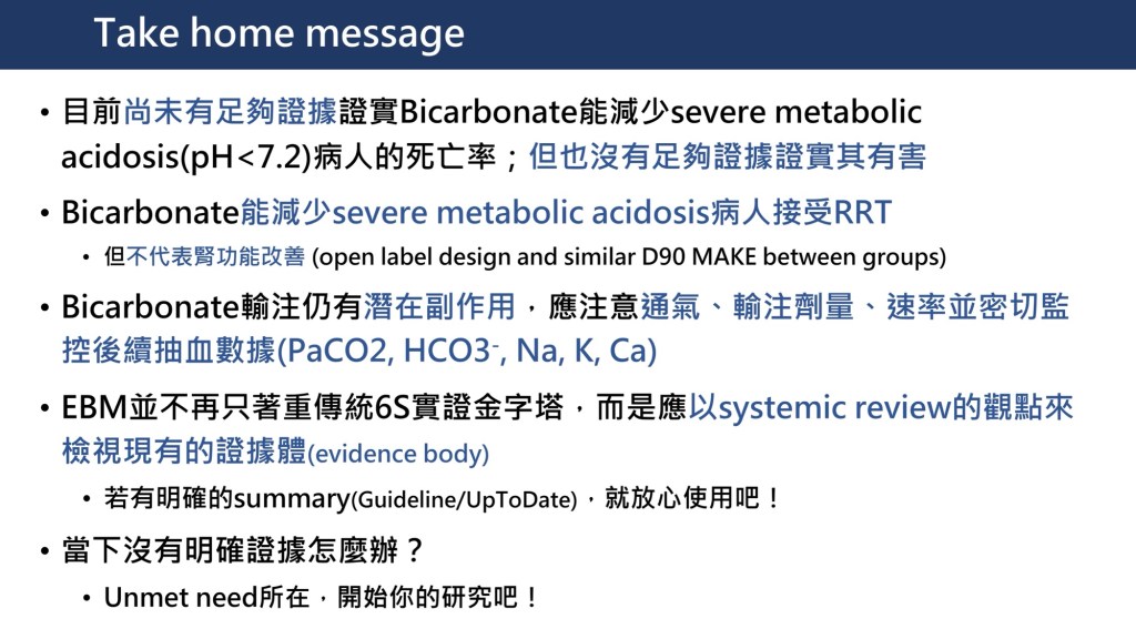 此外,報告中也根據BICAR-ICU trial 的結果,指出整體族群中 bicarbonate 並未顯著降低死亡率,但在 AKIN stage 2–3 的亞族群 中,卻能降低死亡率並減少 RRT 使用。這樣的結果讓我學習到 evidence-based medicine 另外一件重要的觀念,每項研究中的inclusion和exclusion都很重要,研究的結果並非「一體適用」,所以在臨床上需要辨識適合治療的族群。