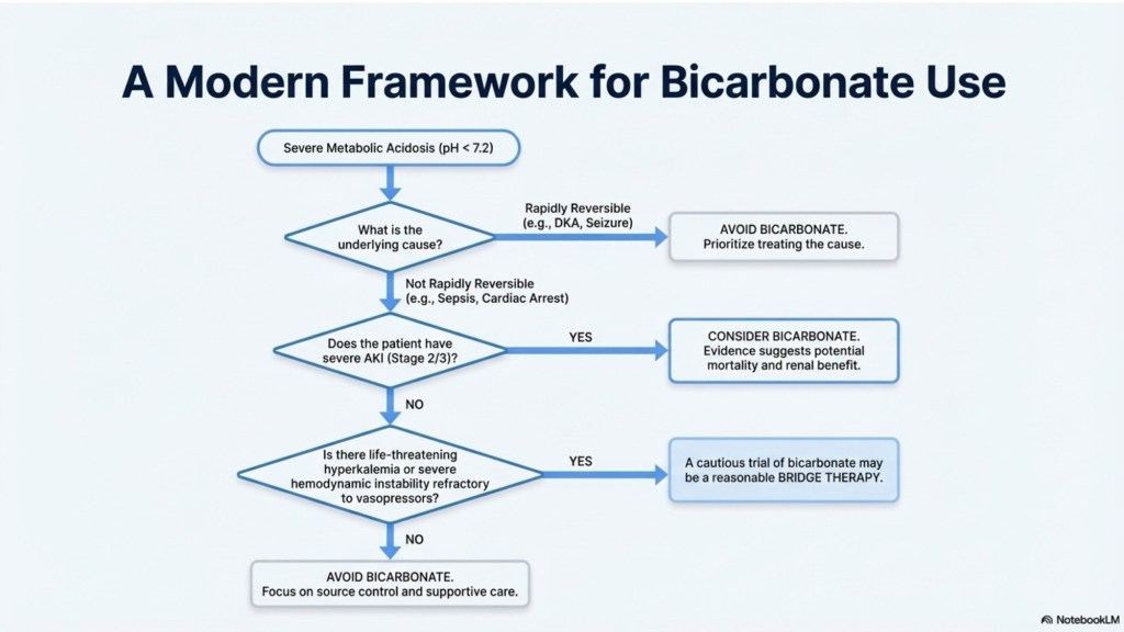 代謝性酸中毒是內科醫師必須熟悉的問題,在ICU裡尤其常見。然而在不同的代謝性酸中毒情境下,是否都適合使用sodium bicarbonate治療目前並無明確定論。藉由EBM的框架,我們重新檢視代謝性酸中毒的生理基礎、潛在風險與使用sodium bicarbonate的臨床效益,整合指引、RCT、目標試驗模擬與統合分析證據,指出目前尚無證據支持sodium bicarbonate可以降低嚴重代謝性酸中毒病患死亡率,但在合併stage 2-3AKI的患者可能減少RRT需求,並強調臨床決策需回歸證據品質與個別病人情境。