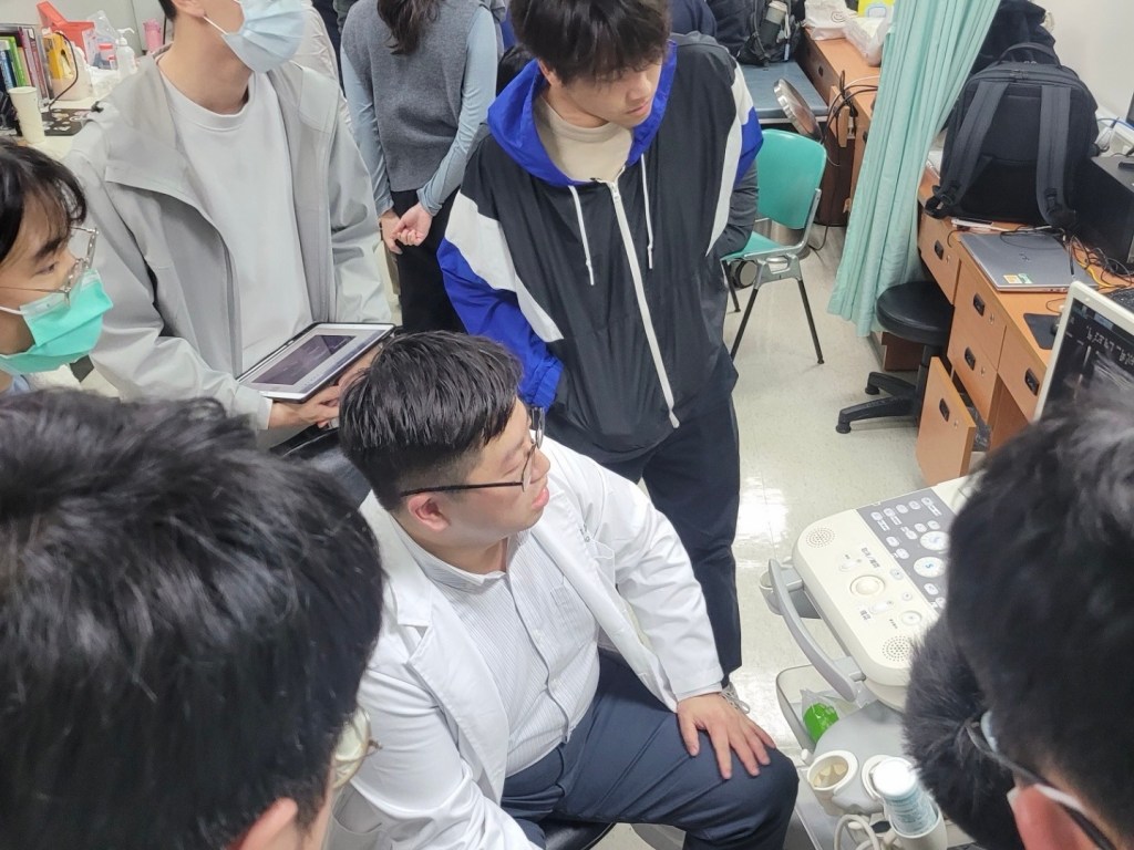 課程初始,老師細心講解超音波機器的基本操作,包括探頭的選擇與手感調整,並分享臨床小技巧。例如在懷疑膽囊炎時,可透過超音波探頭按壓膽囊位置,若誘發明顯疼痛反應,並同時觀察到膽囊壁增厚、膽囊腫大或周圍發炎變化,結合 Murphy’s sign positive 的臨床表現,能更有力地相互驗證診斷。此外,老師也提到空腹雖能讓膽囊更清楚,卻可能使胰臟變得不易顯影,真正體會到「有得必有失」的臨床現實情景。在 common bile duct 的辨識技巧上,老師也特別補充可善用 Doppler 作為輔助工具,透過血流訊號來區分膽管與周圍血管結構,能提升辨識的準確度,對初學者尤其實用。