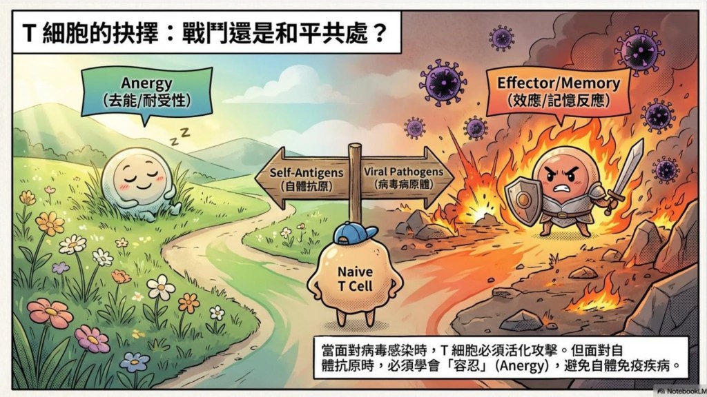 演講的核心,圍繞在 T 細胞的免疫,一個看似熟悉、卻仍不斷被重新理解的領域。在建立基本概念後,黃醫師進一步闡述了在免疫成熟的過程中,Naive T cell 並非一昧遵循耐受 (tolerance) 或記憶 (Memory) 的單一路徑,在 effector phase 的過程中,被反覆刺激的記憶細胞會開始「習慣」敵人(外來抗原)的存在,而緩緩地將角色從「記憶型」轉為「調節型」 T 細胞,以維持整體免疫系統的平衡與穩定。