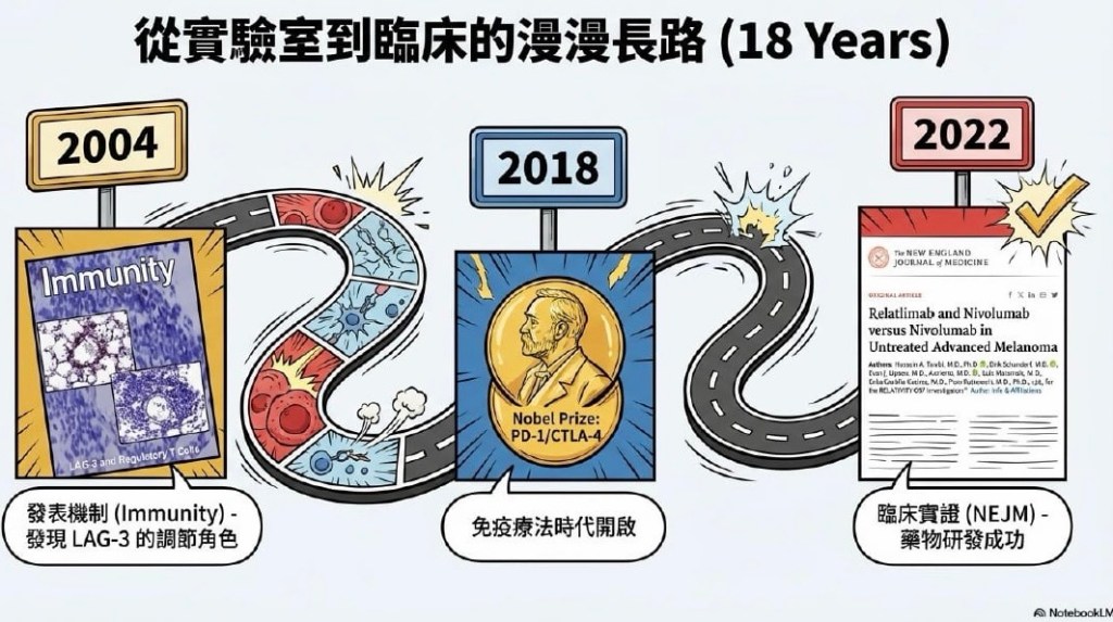 當 effector function 被推過 threshold,免疫系統就能達到「抗腫瘤 (Anti-tumor)」的效果,單純以腫瘤抗原作為 activation booster,往往只傷及腫瘤的一隅;而「剪斷煞車線」、也就是打破免疫檢查點,則如同放出螞蟻雄兵,全面圍攻,直到腫瘤被啃噬殆盡。然而,這樣的策略,適合癌症,卻也足以引起巨大的反噬,因此,在臨床上,常需再以類固醇將效應壓回 threshold 之下,在殺與不殺之間取得暫時的平衡……,從 2004 年 LAG-3 調控機制的首次發表,到 2022 年 anti-LAG-3(Relatlimab)與 anti-PD-1 聯用於無法切除或轉移性黑色素瘤、證實能顯著延長存活,這條路走了十八年,這片貌似偶然發現的綠洲,原來是無數前人反覆試錯,在明知不可為之境中,仍一點一滴累積出的沃土。