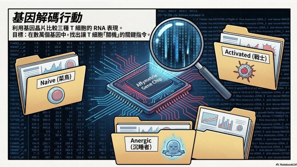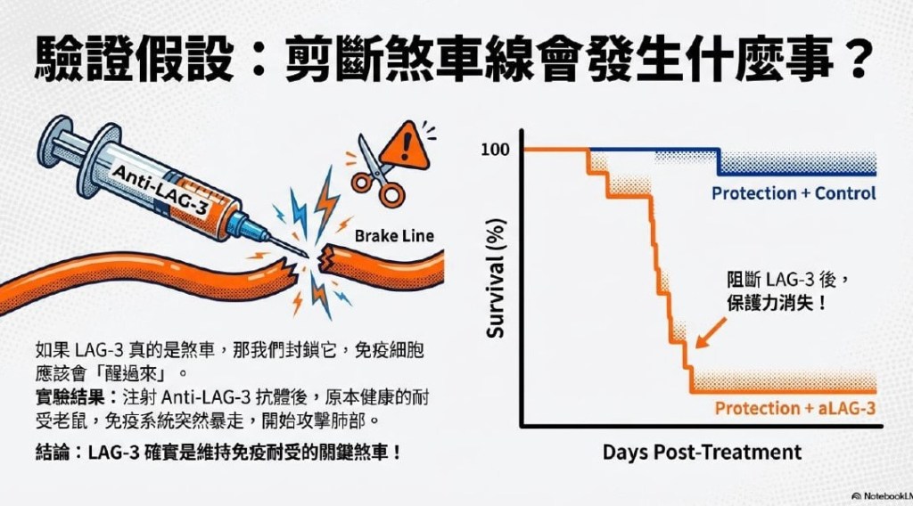 當黃醫師陷入缺乏小鼠的窘境、不得已拿前人實驗過的小鼠勉強試試時,反而在 C3-HA transgenic mouse 的實驗模型中,發現曾經接受高劑量抗原刺激而存活下來的小鼠,其體內原本具攻擊性的 memory T cells,在肺與脾臟中轉化為新一批的戰士,默默形成一道防線,包覆後續入侵的抗原,避免發炎反應擴散、引發致命的血管炎,這個出乎意料的結果成了後續一連串研究的起點,而 LAG-3,正是這個轉折點上的關鍵角色。受到深耕「語音辨識」系統的友人啟發,在數萬個基因的雜訊中,研究團隊嘗試用近似的概念,去捕捉免疫狀態轉換的訊號—以表現量差異作為amplitude、以基因本身作為 frequency-最終,從 36,700 個基因中,LAG-3 作為第 137 號候選者浮現,並在後續抗體實驗中被證實,確實扮演著「煞車線」的角色,引導 memory T cell 走向tolerance。正是這條煞車線,構成了免疫治療中最關鍵、也最危險的分水嶺。