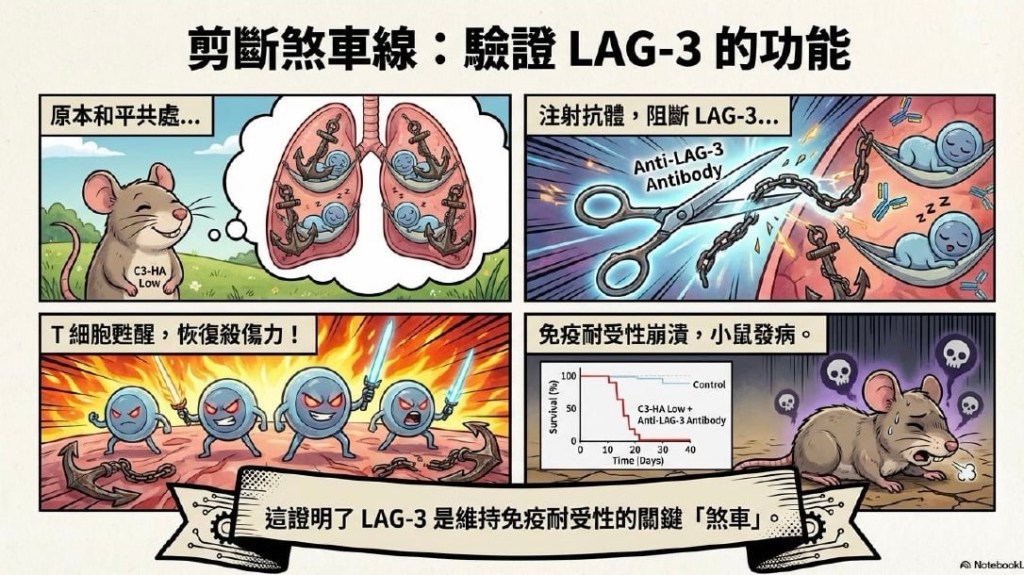 透過 C3-HA 基因轉殖鼠實驗,研究揭示了 T 細胞在誘發免疫耐受過程中會經過一個短暫的效應階段,而 LAG-3 正是在此時差異性表達。實驗證據進一步顯示,使用 LAG-3 抗體 能有效逆轉體內的抑制活性,並增強免疫系統對抗腫瘤的效力。