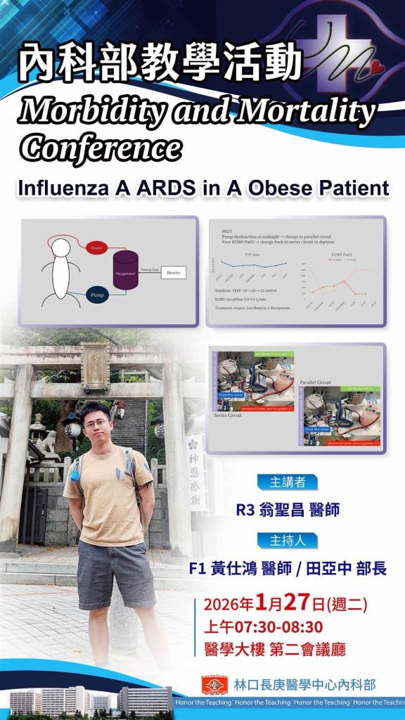 | 1/27 (二) 7:30-8:30 醫學大樓 第二會議廳 | Morbidity and Mortality Conference R3 翁聖昌 F1 黃仕鴻/ 田亞中部長 | https://cgmh.webex.com/cgmh/j.php?MTID=m1df2af927b4cbc7d30f6174ba4036c27 |