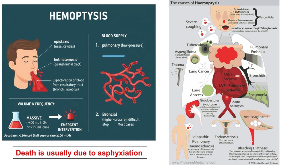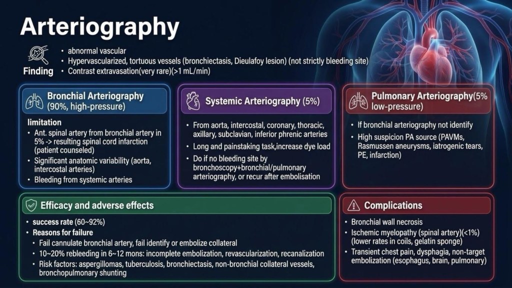 這次的 M&M 報告以 Massive hemoptysis 為核心,透過一位病程橫跨多年、反覆發作的複雜案例,清楚呈現臨床上從急性處置到病因診斷的完整思考歷程。大量咳血的真正致命原因往往並非失血性休克,而是血塊造成的窒息與氣體交換障礙,因此初期處置的優先順序在於維持呼吸道通暢與保護未出血側肺臟,包括及時插管、適當體位、必要時單肺通氣,以及在重症時若病況允許的情境下,使用支氣管鏡清除血塊。而在影像上即使 CTA 未顯示明確 contrast extravasation,也不能武斷地排除持續性出血,後續仍需結合支氣管鏡與血管攝影,尋找潛在的支氣管動脈或小血管異常,並適時考慮 bronchial artery embolization,才能真正降低再出血風險。