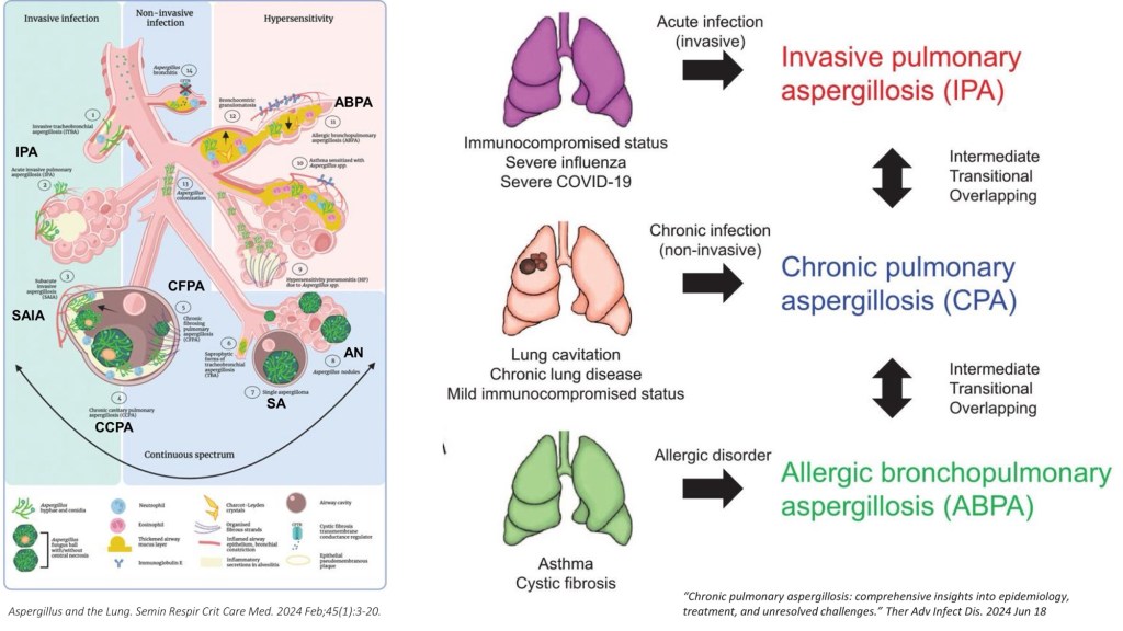學長也在報告中幫我們整理出對 IPA 與 CPA 的比較。IPA 多發生於免疫功能低下族群,病程進展快速,常見血清或 BAL galactomannan 陽性,影像上可見 halo sign或 air crescent sign,臨床上需儘速做出治療決策;相對地,CPA 則多發生於結構性肺病或慢性肺部損傷的病人,特色有病程超過三個月,表現為慢性咳嗽、反覆咳血與體重下降,影像上可見上肺葉空洞、菌球或纖維化改變,診斷上除了以Aspergillus IgG 為關鍵外,也需要先排除其他慢性感染或自體免疫疾病。兩者在流行病學、免疫狀態與診斷工具上的差異,是臨床判斷與治療策略截然不同的關鍵。