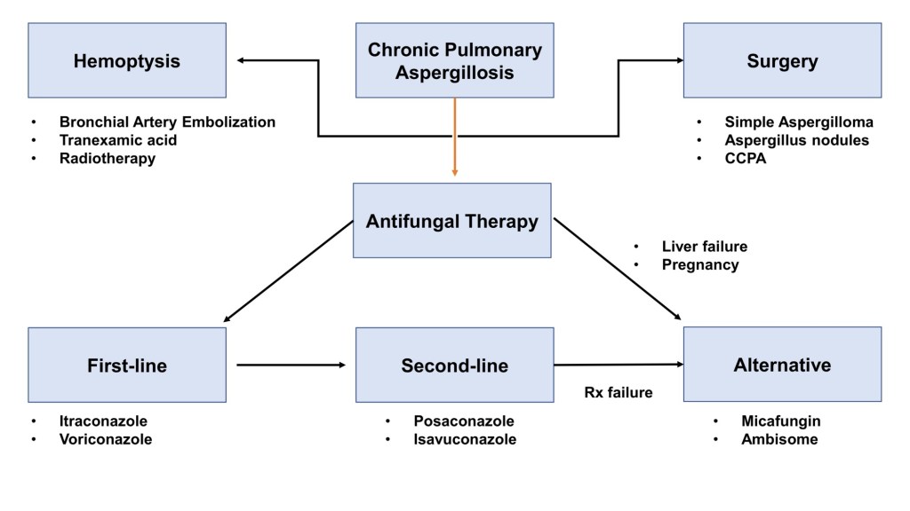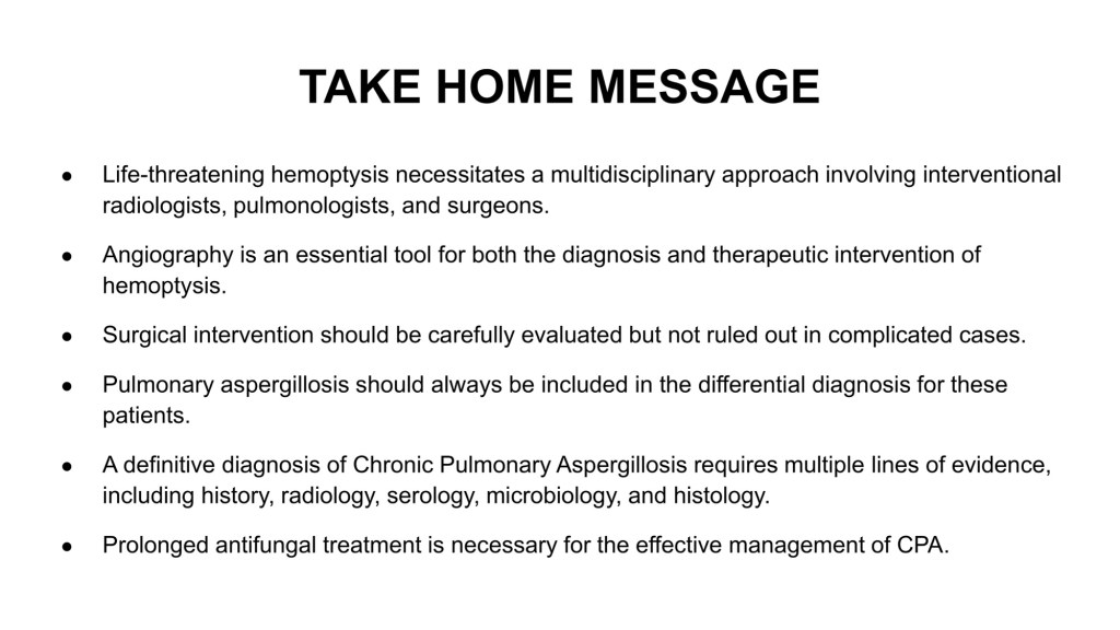 此外,這次討論也讓我對慢性肺麴菌感染有更多認識。這是個隱匿性疾病,常潛伏於台灣高盛行TB、肺癌、COPD族群。病患早期無症或僅輕微咳嗽不就醫,肺部已累積損傷;至大量咳血求醫,常已纖維化嚴重,存活率低。血清學的診斷依賴抗體檢測,而非常規抗原,臨床上易疏忽。此次經驗會讓我未來更提高警覺,遇到疑似的個案,能及早啟動治療,改善病人的預後。