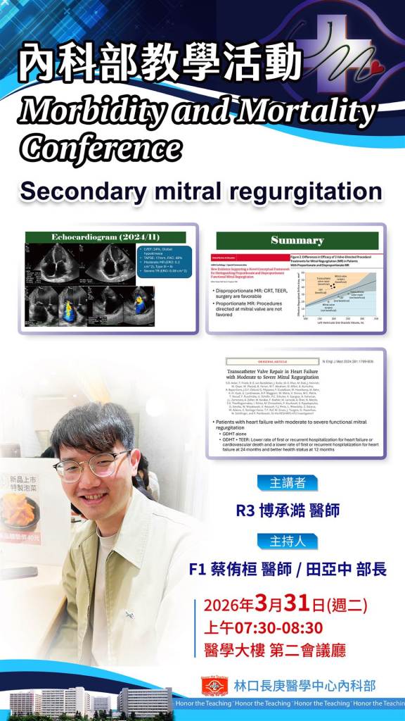 | 3/31 (二) 7:30-8:30 醫學大樓 第二會議廳 | Morbidity and Mortality Conference R3 博承澔 F1 蔡侑桓/ 田亞中部長 | https://cgmh.webex.com/cgmh/j.php?MTID=ma0d2a612644943be095b85f0104cdf01 |