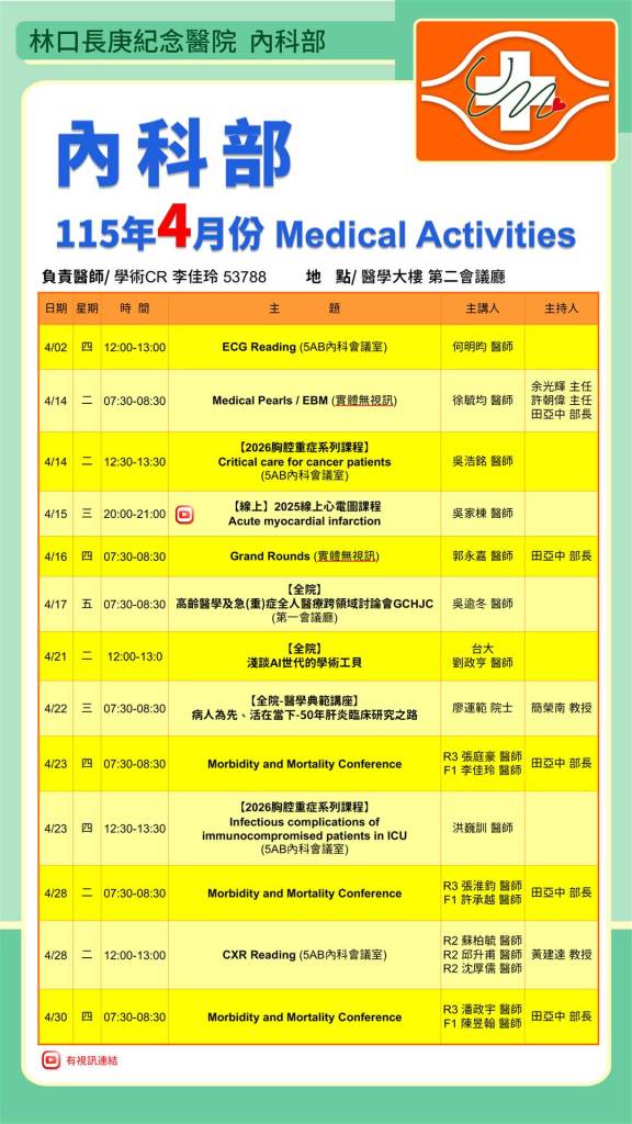 | 4/2 (四) 12:00-13:00 醫學大樓 5AB內科會議室 | ECG Reading 何明昀醫師 | https://cgmh.webex.com/cgmh/j.php?MTID=mbcd1eed49716ae36da6ae72f8a0d2db4 |