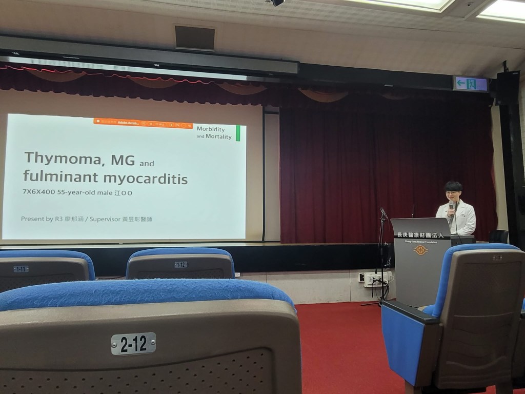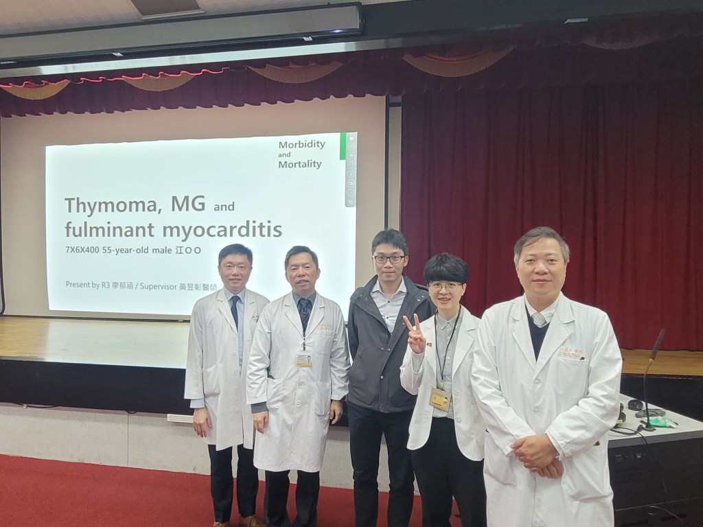 本次內科部晨會 MM conference 討論的是一位 55 歲男性個案,主訴左側背部痠痛約一週,疼痛範圍由胸椎延伸至左肩胛,後續合併呼吸喘與活動時呼吸困難而至急診。初始評估發現病人有心搏過速、呼吸急促與高血壓,實驗室檢查顯示CRP、肝功能與 troponin-I 顯著上升,心電圖出現 RBBB 與 V1-V3 T wave inversion,胸部影像則發現左前縱膈有約 7.5 cm 軟組織腫塊,因此一開始以NSTEMI 收治 CCU。住院後病情快速惡化,出現呼吸衰竭、心因性休克與complete AV block,床邊 echo 與後續檢查高度懷疑 fulminant myocarditis,需插管、CVVH、暫時性節律器與 V-A ECMO 支持。之後接受縱膈腫瘤切除,病理證實為 thymoma,且合併 acetylcholine receptor antibody 陽性與 myastheniagravis。整個住院過程非常複雜,包含 hemothorax、呼吸器脫離困難、myasthenic crisis、CMV viremia、Good syndrome、AKI、反覆感染、傷口感染與DVT 等併發症,歷經多次侵入性治療、血漿置換、IVIG、抗感染治療與神經科、腎臟科、心臟科、胸外科等跨團隊照護,最終病況逐步穩定並成功出院。此案例充分展現胸腺瘤合併 MG 與猛爆性心肌炎的高度危急性,也反映早期辨識與整合治療的重要性。