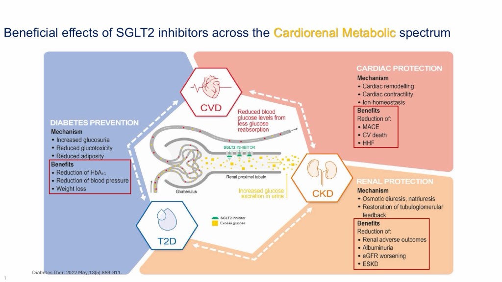 過去治療以 HbA1c 為主要目標,著重於微血管併發症的預防;然而,隨著心血管結果試驗的發展,臨床逐漸意識到降低血糖並不足以全面改善病人預後。多項大型隨機對照試驗證實,SGLT-2 inhibitor 除了降血糖外,尚能顯著降低心血管死亡、心衰竭住院及腎功能惡化風險,顯示其具有超越血糖控制的器官保護效果,並進一步促使臨床治療指引的改變。