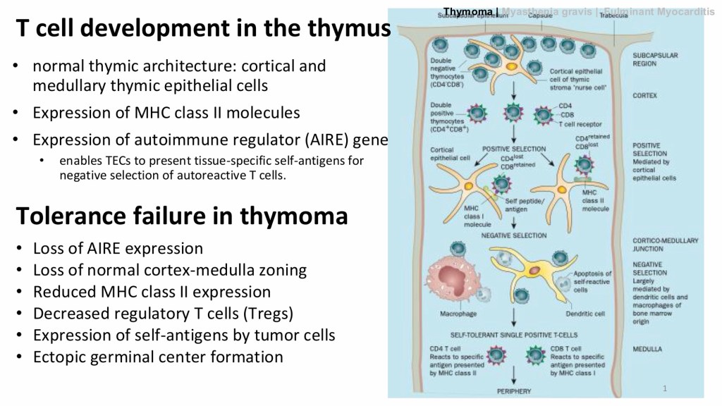 討論首先聚焦於 thymoma 的基本概念。胸腺瘤是源自胸腺上皮的腫瘤,整體發生率不高,生長通常較慢,主要以局部侵犯為主,但仍有晚期復發的特性。分類上可依 WHO 分為 A、AB、B1、B2、B3 與 C 型,其中本案為 WHO type AB,屬 mixed thymoma ; 分期則以 Masaoka-Koga system 較能反映預後,本案為 stageI,代表腫瘤仍侷限於包膜內。課程也說明 thymoma 與免疫耐受失調的關聯,包括 AIRE 表現缺失、皮質與髓質結構異常、MHC class II 表現下降、Treg 減少與異位 germinal center 形成,因此容易合併副腫瘤症候群,尤其是 myasthenia gravis、pure red cell aplasia 與 Good syndrome。臨床表現除了腫塊壓迫造成的胸痛、咳嗽、喘與 SVC syndrome 外,也可能以各種自體免疫疾病表現。治療方面,早期病灶以 complete surgical resection 為主,較高期別則需結合放療、化療或neoadjuvant CCRT。最後,討論延伸到 thymoma、MG 與心臟侵犯的關係,指出myocarditis 是 MG 在心臟最重要的表現之一,雖多數較輕,但少數可進展為fulminant myocarditis 與 cardiogenic shock,其中 giant-cell myocarditis 為最嚴重型態,而合併 thymoma 更是不良預後因子。整體而言,這次討論讓我更理解thymoma 不只是胸腔腫瘤,更可能是牽動神經肌肉、免疫與心臟多系統病變的核心疾病。